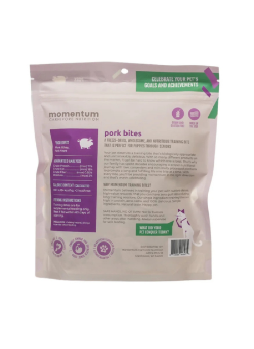 Momentum Carnivore Nutrition focuses on providing biologically appropriate, raw, and minimally processed treats free from artificial additives and fillers. Proudly made in the USA, these pork bites are grain-free and gluten-free, supporting pet parents who prioritize wholesome, all-natural training treats.