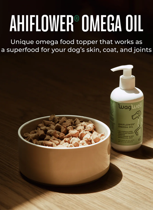 Meet Ahiflower Oil, the unique omega food topper that works as a superfood for your dog’s skin, coat, and joints. Our robust blend of plant-based omega acids (3,6 + 9) is made with both dog and planetary health in mind, an all-in-one omega oil with no fishy smell (bye, fish burps).