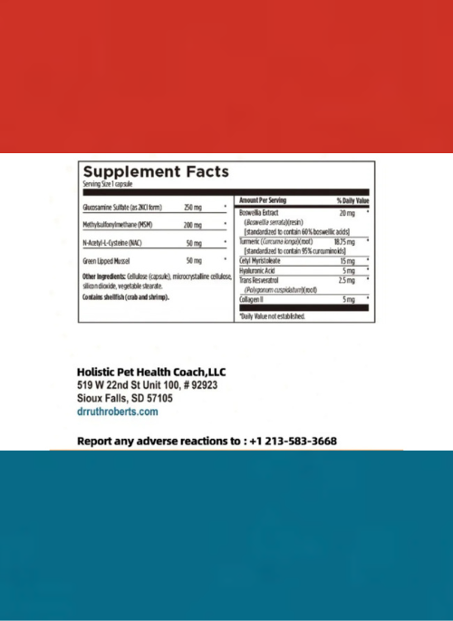 - Glucosamine for cats and dogs, MSM, Green-Lipped Mussel, and UC-II Collagen