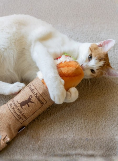 Capture your cat's attention with P.L.A.Y.'s Feline Frenzy Tuna Baguette Kicker Toy – the ultimate playmate for bites, kicks and boundless tussles! Crafted from luxe fabrics and infused with USDA-certified organic catnip, this kicker toy promises an irresistibly engaging experience. The Tuna Baguette features enticing textures that will keep your cat hooked, providing endless amusement during solo play. Elevate your feline friend's playtime with this delightful toy that combines high-quality materials and the allure of organic catnip for an off-the-hook experience!