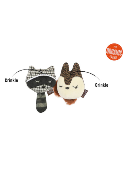 Your cat will take on the role of forest ranger when playing with P.L.A.Y.’s Feline Frenzy Bandit Buddies Toy Set. This mischievous, snack-stealing duo will keep your furiend on their toys with their USDA-certified organic catnip.