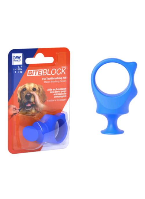 How to brush dog teeth. The small Paw Ready Biteblock is designed to allow you to brush your pet’s teeth without constantly worrying about getting bitten. The unique natural rubber design protects your fingers while gently probing your pet’s mouth to allow for brushing.