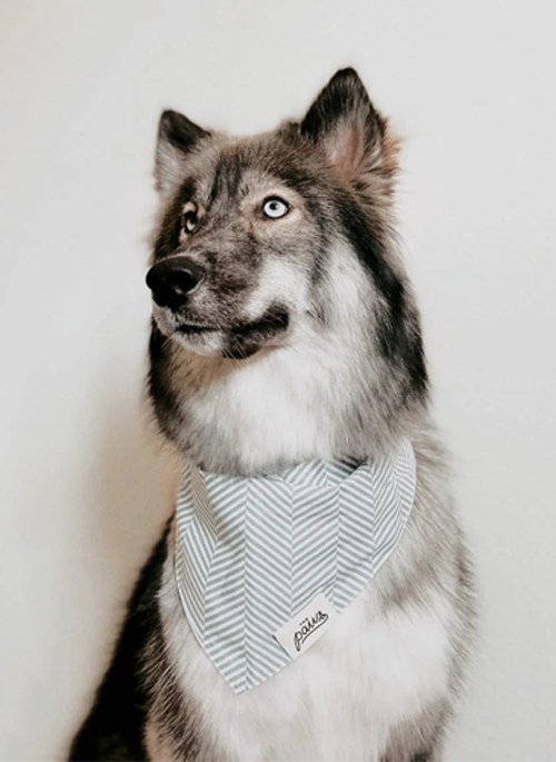 Breezy - a staple print design for your dog. Muted blue herringbone on white cotton