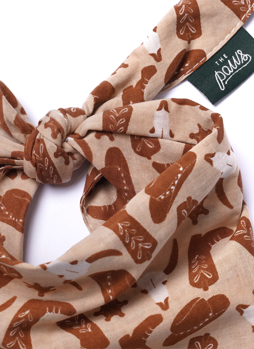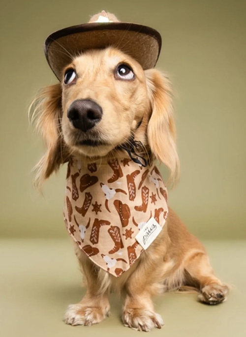 Boots and sheriff stars, this is the Wild West! Sand colored bandana with rust colored detail.