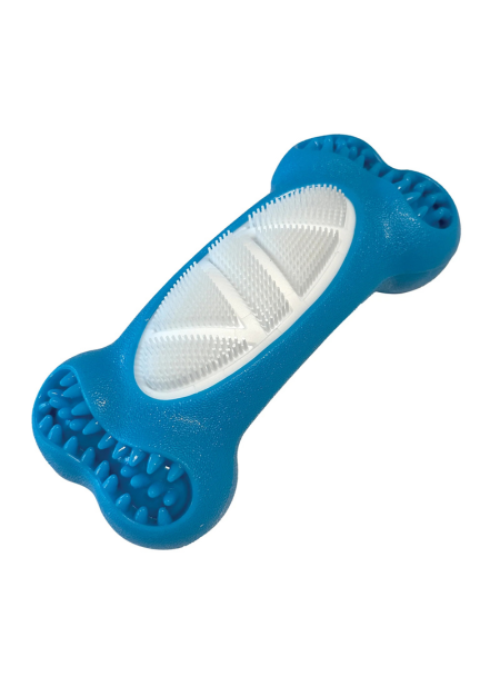 Introducing the Brush ‘n Bite self-brushing toy! It’s a toothbrush + toy in a fun bone shape. With built-in bristles, simply place some dog friendly toothpaste on the bristles, and give to your dog to let them brush while they play! Larger rounded spikes help massage gums as they chew. A built-in squeaker adds to the engagement. Great for small to large breeds. Ideal for gentle to tougher chewers.