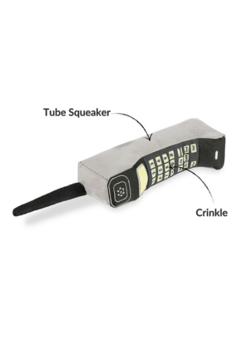 Step back in time with P.L.A.Y.'s 90s Classics, 90s Are Calling toy! This fun and nostalgic block cellphone features a tube squeaker for an authentic ring that will take you and your furry friend down memory lane. The crinkle fabric adds an extra layer of playtime fun, and your pup will love dialing in their BFF’s number with this retro-inspired toy!