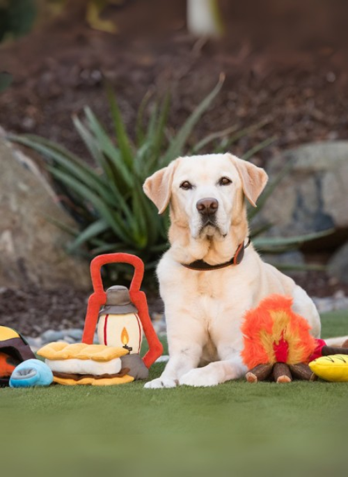 Inspired by our beloved office dog and head product tester Corbin’s love of the great outdoors, P.L.A.Y.’s Camp Corbin Dog Toy Collection was born. This collection is comprised of all of his favorite camping essentials in plush toy form including a tent with cozy sleeping bags inside and a tasty carob s’more to enjoy by the campfire.
