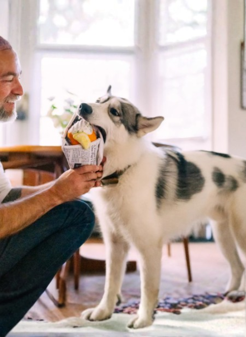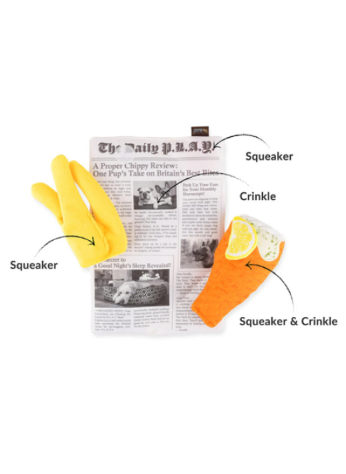 - Detachable crinkly fish and squeaky fries wrapped in a soft, playful newspaper that are perfect for fetch, chomps and curious chewers