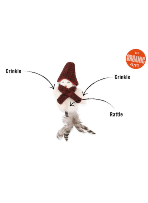 Meet P.L.A.Y.'s Feline Frenzy Chirpy Birdie Toy, a dapper, wintery-dressed birdie toy that will have your cat entertained all season long. This cuddly companion features irresistible crinkles, cheerful rattles, and adorable feather details, making it a must-have for your furry friend's holiday toy collection.