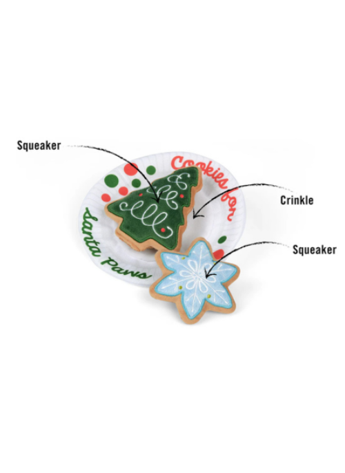 Give your pup the chance to enjoy Santa Paw's secret stash of cookies with P.L.A.Y.’s Merry Woofmas Christmas Eve Cookies toy! This delightful plate, adorned with crinkles, features two removable squeaky cookies for a festive and interactive playtime.