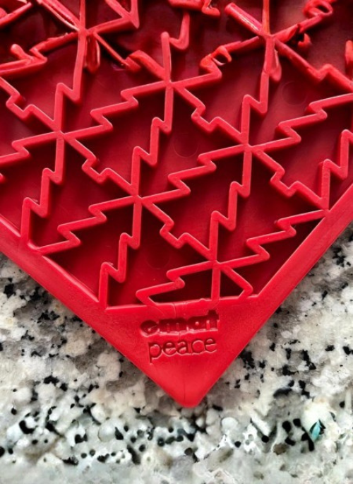 - Spread a thin layer of your dog's favorite soft treat (peanut butter, yogurt, wet food, or purée) across the textured peace tree surface.