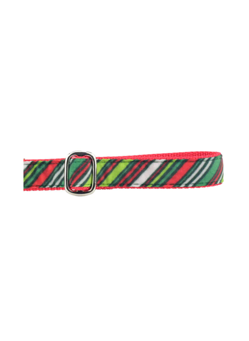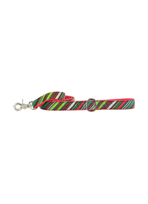 The ribbon/nylon (essential) leash is made with ribbon on one side and strong nylon webbing on the other. It is only available in 5 ft with silver hardware.