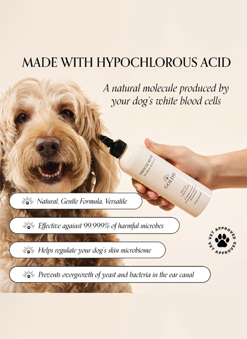 Our vet & dermatologist approved, gentle hypochlorous acid ear rinse keeps your dog's ears clean, healthy, and irritation-free, and the gentle hypochlorous acid spray is effective against 99.999% of harmful microorganisms and supports healthy skin.