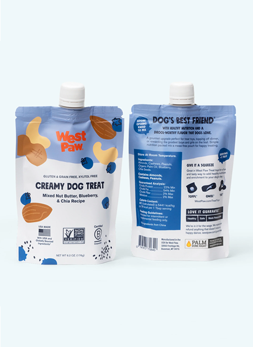Humans love their nut butter, and so do dogs! West Paw mixed up creamy dog treats with fresh ground peanuts, almonds, cashews, blueberries, and chia - all in a mess-free dispenser. No sugar, no Xylitol, no preservatives, no artificial sweeteners, (or artificial anything) - just solid, simple nutrition for happy treating.