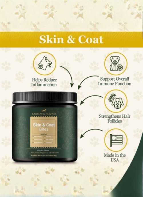 - Skin & Coat Bites – Enriched with Omega-3, Biotin, and Zinc to nourish your dog’s skin, reduce dryness, and give their coat a glossy, healthy shine