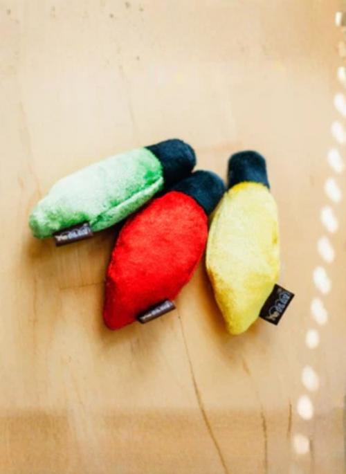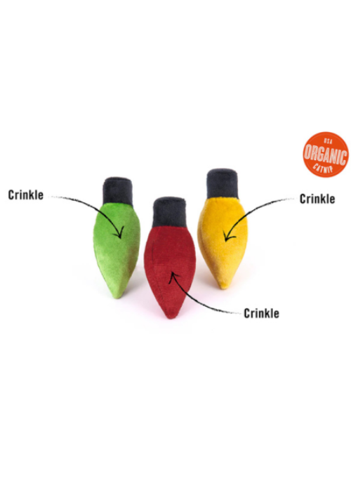 Illuminate your cat's holiday with P.L.A.Y.'s Feline Frenzy Kitty Delights toy set filled with USDA-certified organic catnip and featuring crinkly fun!