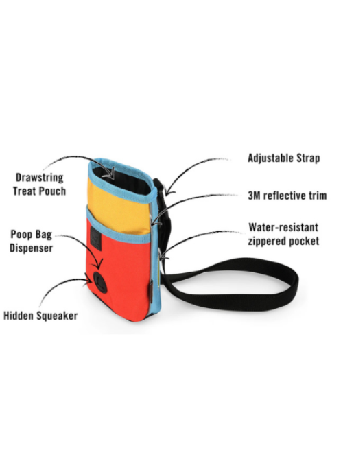 Detachable and adjustable strap can be worn as a crossbody or as an over-the-shoulder training bag. Strap can also be used around the waist, or you can attach to your own belt with convenient belt loops for easy access to the dog waste bag holder. Sides are lined with 3M reflective stripes for evening strolls. Approved by pooches and humans alike, this will be your go-to accessory for any journey with man’s best friend.
