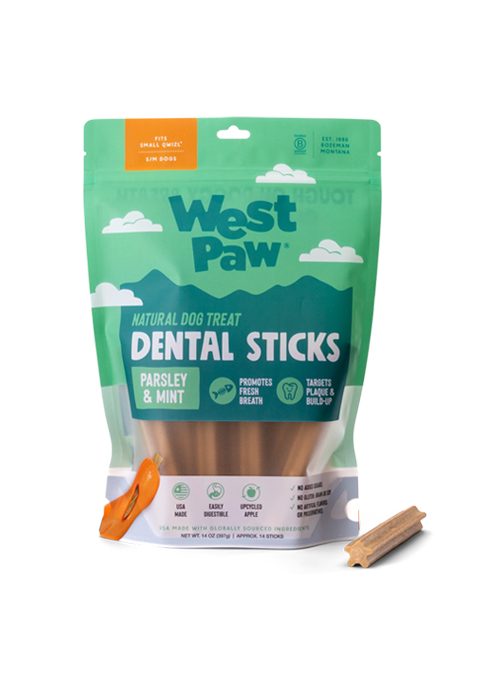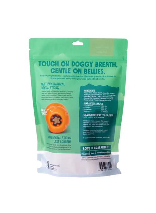 The Small Winter Mint Qwizl® is a limited-edition color available only in this bundle with Dental Sticks - once it's gone, it's gone. Paired with West Paw Dental Sticks, this exclusive set gives dogs a healthier, long-lasting chew. Dental Sticks freshen breath and help reduce plaque and tartar with clean, simple ingredients like parsley, mint, and upcycled apple. Designed to fit perfectly inside the Small Qwizl®, they turn chew time into an engaging dental routine.