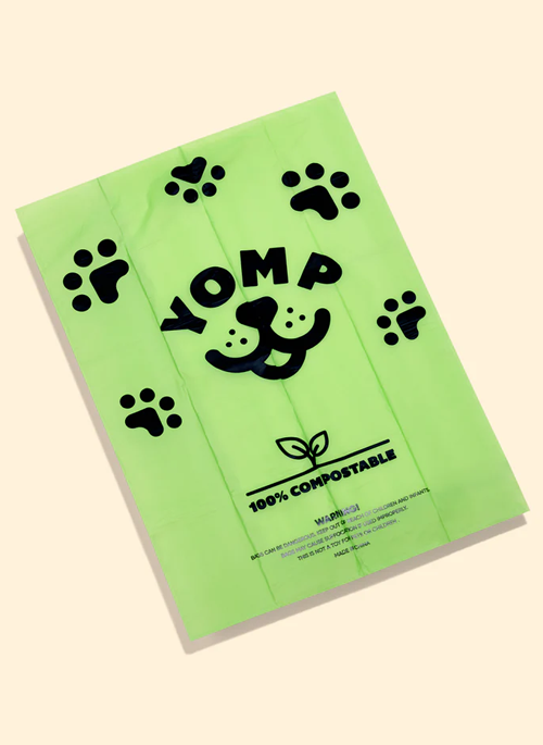 Keep your community clean with our compostable cornstarch poop bags! At Yomp, we’re not only committed to keeping our neighborhoods free of doggie doo doo, but also to eliminating single-use plastic. And you can go totally eco-friendly by using our 100% silicone bag dispenser that slips onto your wrist or attaches easily to your dog's leash.