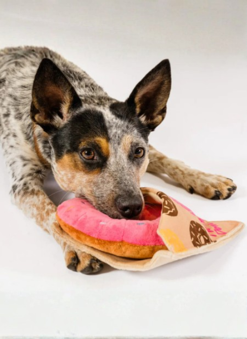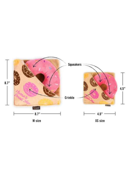 Satisfy your pup's sweet tooth with P.L.A.Y.'s Pup Cup Café Doughboy Donut toy! Available in two sizes, this pink confection features two squeakers in the doughnut's body for double the fun and a detachable crinkle sleeve for an extra layer of texture during playtime. Treat your dog to the sweetness of the perfect pastry!