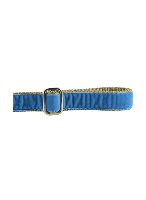 This leash is available in three lengths. The 4 ft and 6 ft lengths are made with dusty blue velvet on both sides and a tan inner lining. You can choose between solid brass or nickel-plated zinc hardware. The 5 ft essential leash is made with dusty blue velvet on one side and tan nylon webbing on the other side. It is only available with silver hardware.