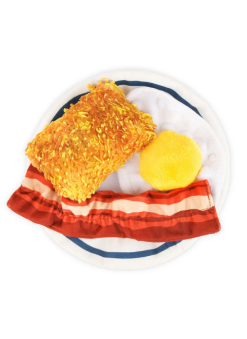 Serve up a tasty playtime with IHOP x P.L.A.Y.’s Eggcellent Play Platter toy! This four-in-one toy features a fun textured squeaky hashbrown, stretchy and crinkly bacon, plus a squeaky egg - all detachable to be played with together or separately. The iconic IHOP plate is crinkly all over for added fun. Great for multiple dogs to play with at once, this versatile and engaging toy is the recipe for fun!