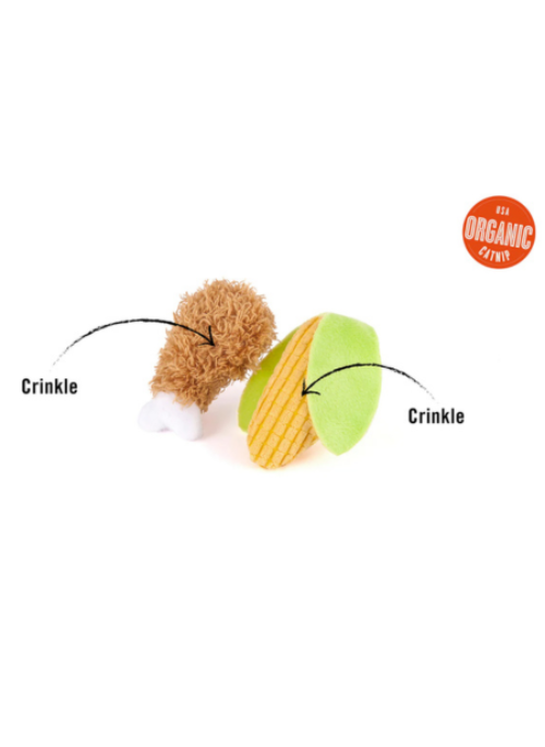Give your kitty a taste of outdoor fun with P.L.A.Y.'s Feline Frenzy Purrfect Picnic toy set! This crinkly chicken leg and corn combo are perfect for satisfying your cat’s playful instincts, infused with USDA Organic Catnip for extra amusement.