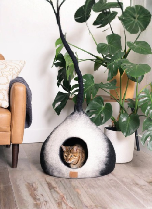 Elevate your space with this fuzzy cat tail bed, which serves as both a luxurious retreat and a striking design statement. Handcrafted from 100% organic New Zealand felted wool, this wool cat cave creates the perfect hideaway for your feline companion. The flowing, artistic silhouette transforms an everyday pet accessory into a compelling visual centerpiece that effortlessly sparks conversation among visitors while inspiring playful engagement from your discerning pet.