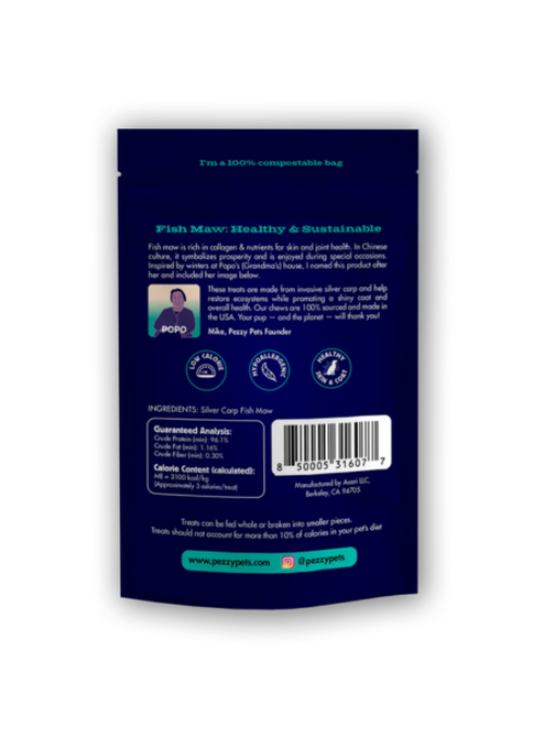 Our fish maw chews are an excellent moderate chew for dogs of all ages and sizes. Fish maw comes packed with tons of collagen, protein and other vital nutrients, making it great for skin and coat health!