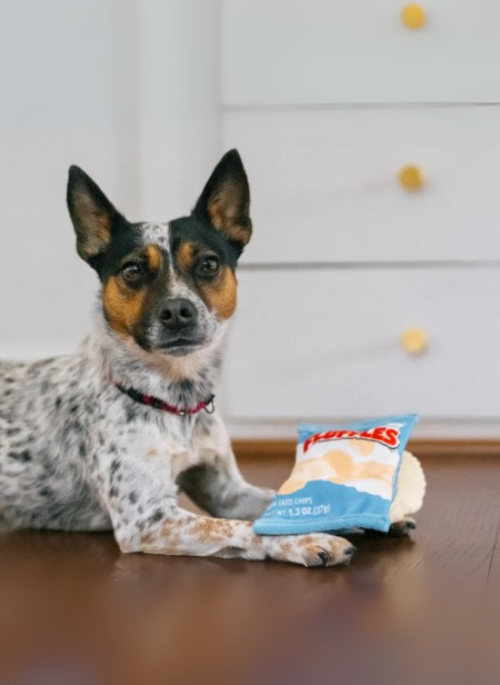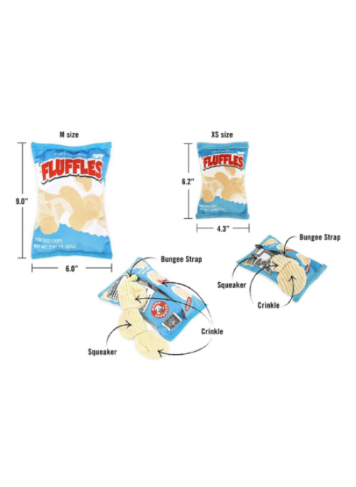 P.L.A.Y.'s Snack Attack Fluffles Chips is the ultimate paw-licking toy for all those chip-loving pups! Available in two sizes, this savory bag of chips features three squeakers shaped like everyone’s favorite crunchy treat, all attached on a bungee cord for interactive fun. With an added crinkle feature that mimics the sound of a chip bag, it’s the perfect snack for your furry friend’s entertainment!