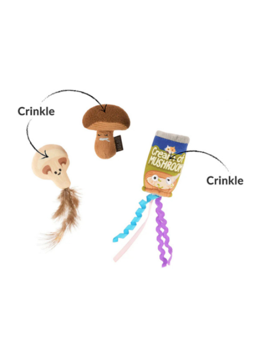- Trio includes two feather-topped mushrooms and a plush cream of mushroom can with curly strings for batting, swatting and wrestling fun