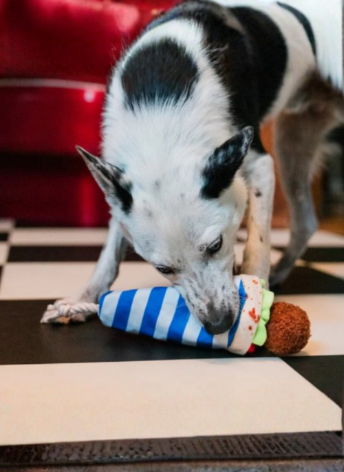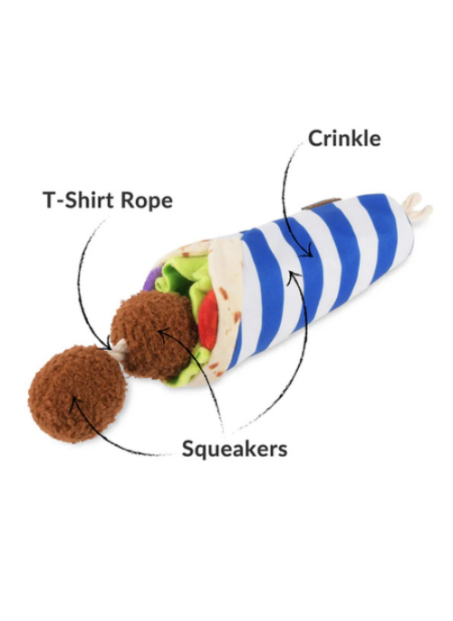 Straight from the food truck to your pup’s toy bin! Inspired by the flavors of the Middle East, P.L.A.Y.’s International Classic Fur-lafel Wrap is stuffed with playtime flavor. With two squeaky meatballs on a sliding rope, crinkly veggie layers and room to stash treats inside, this plush toy delivers endless tugging, twisting and squeaking fun for dogs with a taste for global adventure.