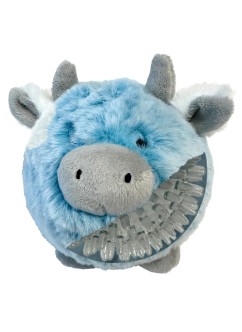 Our ever popular 2-in-1 toys are now available in these adorable cows! Each toy is encased in a luxuriously soft faux rabbit fur that is dyed in 2 tones giving it added dimension. The snout is stuffed, for those who love some de-fluffing action. The ears and horns make it easy to grab the toy and fling around. Every 2-in-1 Spiker Toy includes a hidden spiked TPR ball inside to find after getting through the plush casing! The TPR ball features a built-in squeaker for extra engagement. The soft spikes help massage gums and clean teeth while chewing.
