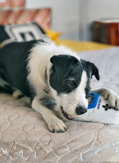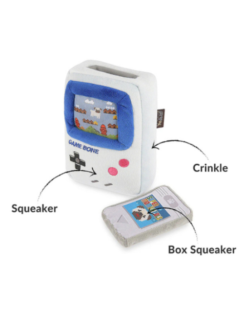 Level up playtime for your furry gamer with P.L.A.Y.’s 90s Classics Game Bone toy! This Gameboy-inspired toy boasts a detachable video game named “Super Momo & Pals” with a box squeaker inside for double the fun. The game bone itself features a squeaker in the body for thrilling play and crinkle fabric on the sides for an extra touch of texture. Watch your pup embark on a canine quest with Momo and her pals in every play session!