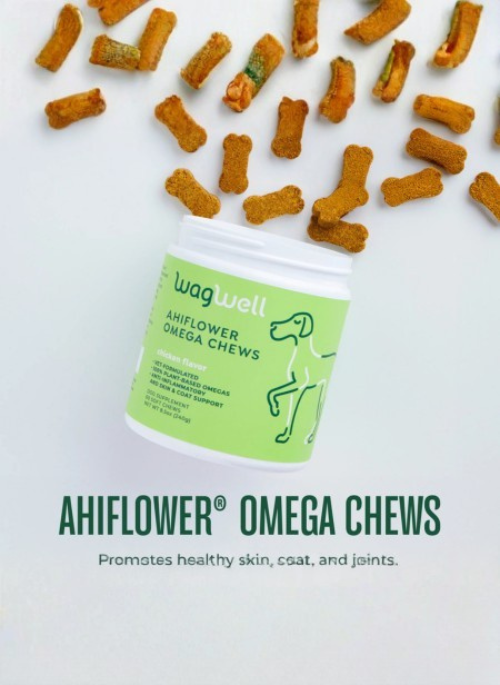- Ahiflower Omega Chews (60 ct) - Chicken flavored chews packed with omegas to promote healthy skin, coat, and joints.