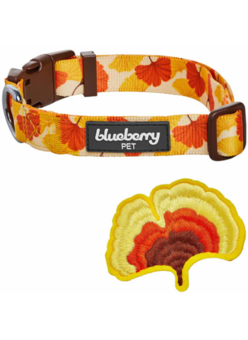Celebrate autumn in style with the Fall Ginkgo Biloba Leaf Thanksgiving Dog Collar for Pets from Blueberry Pet. This collar blends a creamy base with vibrant ginkgo leaf accents to bring seasonal charm to every walk, making your pet the center of autumn style. Designed for comfort and durability, it features high-density 100% polyester webbing that stands up to daily adventures while staying soft against your pet’s neck. The detachable décor adds playful versatility: a pumpkin/maple accessory can be attached for festive flair or removed for a simpler look as the leaves change. Easy customization lets you switch moods with the season.