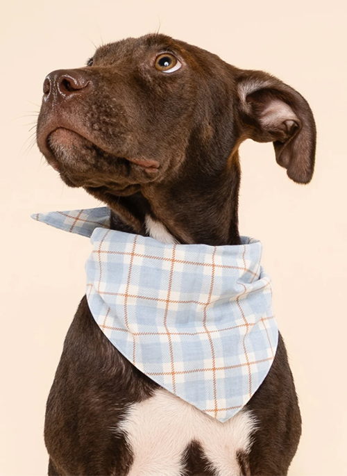 Soft blues with fine orange detail, this hand-screened cotton bandana is designed and made by The Paws.