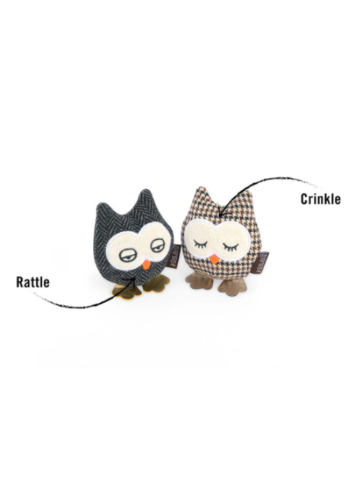 Let your cat’s curiosity take flight with P.L.A.Y.’s Feline Frenzy Hooti-ful Owls toy set! These charming tweed owl toys are perfect for pouncing and playing, featuring a sleepy owl with crinkle for added excitement and a doopy owl with a rattle for delightful surprises. Both are packed with USDA Organic Catnip to engage and entertain your feline.