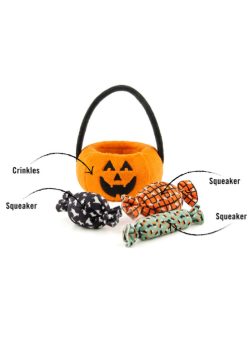 - Amuse your pup with this crinkly, fun Halloween pumpkin basket complete with three squeaker-filled candies!