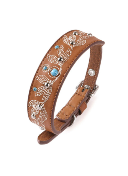 This collar delivers a perfect balance of form and function. The expansive width distributes pressure for everyday wear and special occasions, while the intricate embroidery and turquoise accents showcase craftsmanship that stands out wherever you go. When paired with a secure leash, it becomes a reliable daily accessory that elevates your pet’s look with a touch of artisan flair.