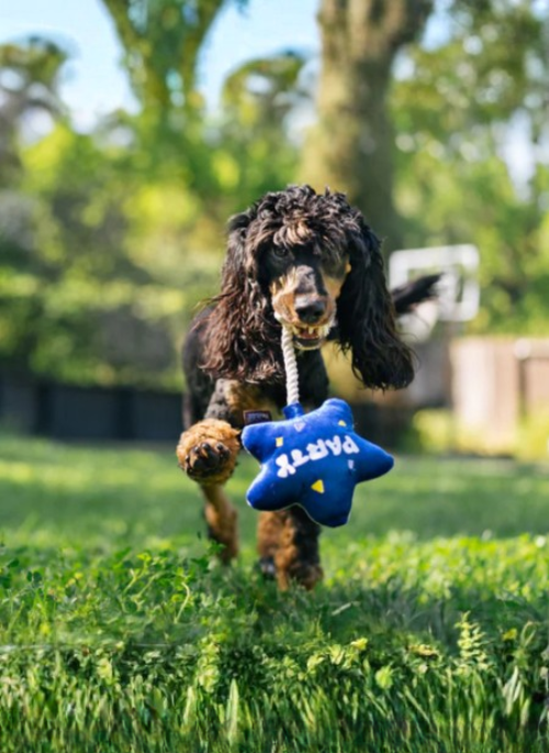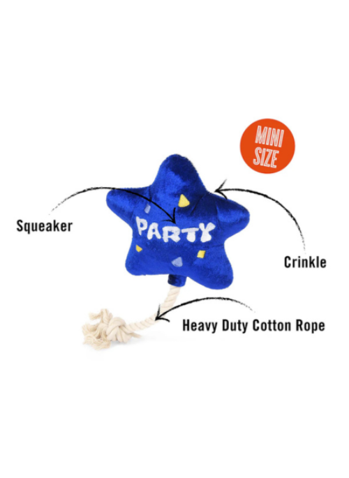 Bring joy to every playtime with P.L.A.Y.'s Party Time Best Day Ever Mini Balloon! Perfectly sized for tiny pups, this extra-small toy features a squeaker for excitement, crinkle fabric for texture, and a durable cotton rope for easy carrying. Make each day a celebration of happiness for your petite canine companion!