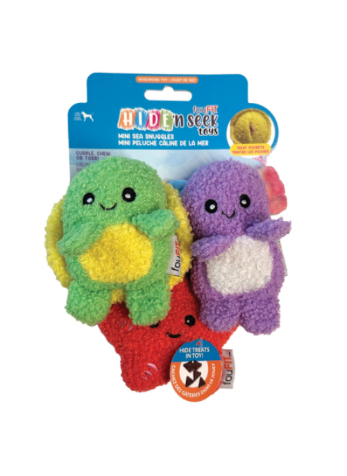 What’s better than one soft, snuggly toy? 3 of them! This pack comes with 3 bright sea characters. A pocket is thoughtfully included on the back of each toy to hide treats inside! All the toys are fabricated with a soft, loopy plush. A squeaker is hidden inside for added engagement. Each toy is made small to easily fit small mouths. Large dogs who like to snuggle or carry around toys may also enjoy these! Treat hiding nosework toys are shown to reduce anxiety and improve cognitive function. Great for puppies and toy/small breeds.