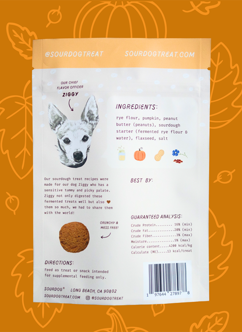 Our seasonal fall flavor. A tasty twist on pumpkin pie made for dogs so that they won't feel left! Pumpkin is rich in fiber and is a perfect companion to our sourdough starter for your pup's digestive health.
