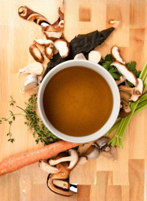 - Water, mushrooms (shiitake, lion's mane, oyster), carrots, celery, garlic, parsley, kombu, thyme