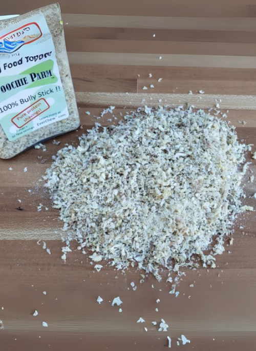 - Is your pup a picky eater?! Look no further! Fresh from our Bizzy Pup R&D team is this exciting new EverChew product! Poochie Parm is 100% Premium All-Natural Bully Stick shavings. We installed a special vacuum system on our drill to catch these tasty delights in a clean and safe way for your pooch