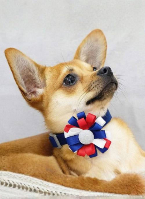 The set features a flower accessory with a sparkling silver center and a detachable star pendant, designed to add a touch of Americana to any collar or harness.