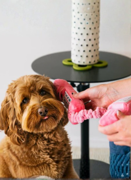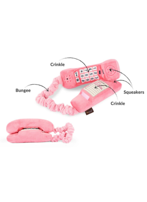 Stay connected with P.L.A.Y.'s 80s Classics Paw Talk toy that brings a pop of pink and entertainment to your pup's world! It features two squeakers at the top of each piece for added excitement, crinkle material in the dialer and middle handset area for a texture-rich experience and a bungee cord to mimic the look of a coiled phone cord. Watch your furry friend engage in playful conversations where every call is an amusing connection!