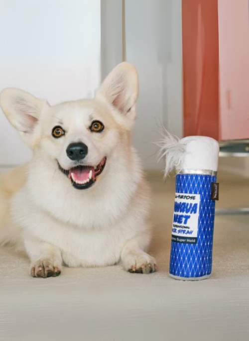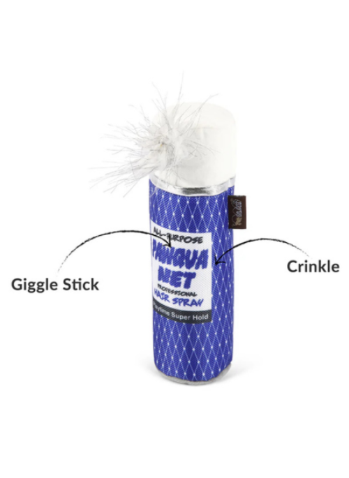 Unleash the glamour for your pup with P.L.A.Y.'s 80s Classics Pawqua Net toy! This hairspray bottle-inspired toy features a giggle stick for added amusement, encased in a crinkle material outer body that adds an extra layer of fun. Watch your furry friend strut their stuff with this chic toy, where every play session is a canine runway!