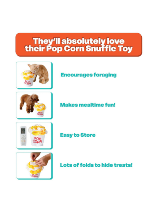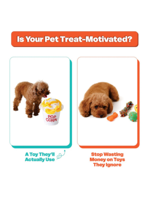 - This food-themed pet toy isn't just a snack—it's an interactive puzzle! Your pet will love foraging through the plush, fluffy popcorn pieces to find the treats you've hidden inside the bucket. It’s a rewarding game that keeps their mind and nose busy for minutes at a time