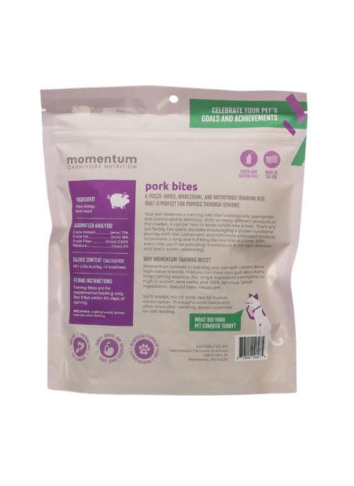 Momentum Carnivore Nutrition focuses on providing biologically appropriate, raw, and minimally processed treats free from artificial additives and fillers. Proudly made in the USA, these pork bites are grain-free and gluten-free, supporting pet parents who prioritize wholesome, all-natural training treats.